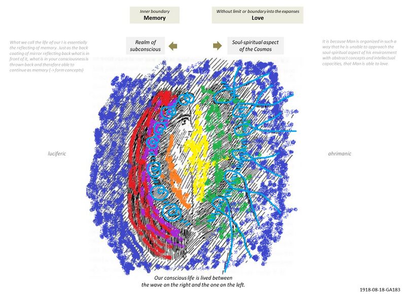 In the process during death and a new birth these are experienced as a rhythm between inner reflection (memory connected with human egoism and human freedom) and outer connection (morality, the outcome of experiencing love, is a result of communion with higher hierarchies). Here on Earth these experiences come to expression, not as a rhythm, but as two co-existing human faculties: the faculty of love and the faculty of memory.