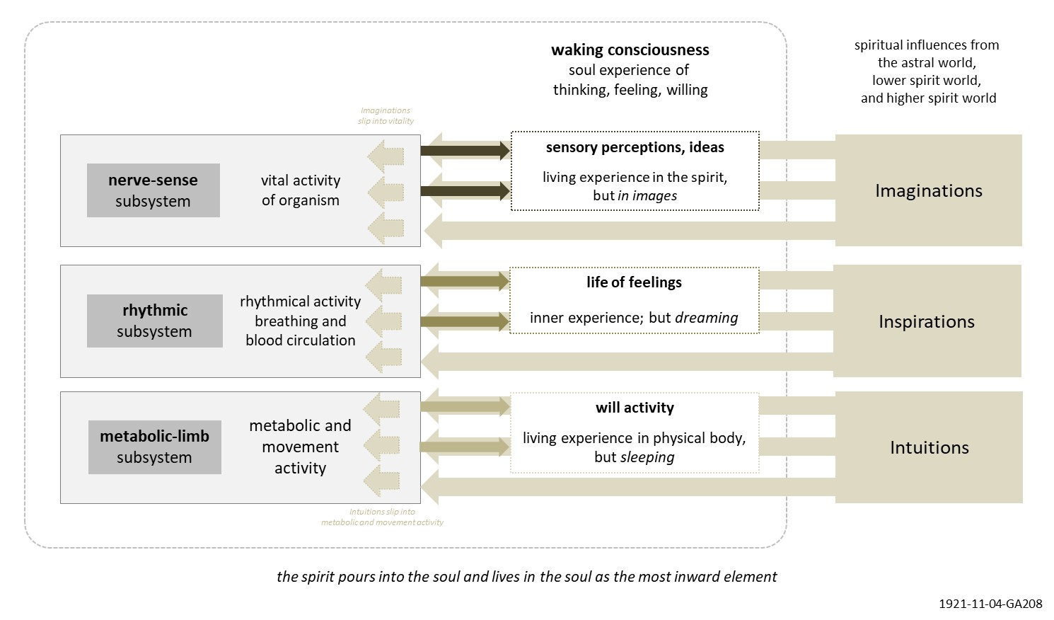 Parts of these are reflected and enter our conscious awareness, making up the contemporary waking consciousness and soul experience of thinking, feeling and willing. The majority however flows into the human organism and the three subsystems of Man as a threefold being. Hence the process of perception underlying conscious awareness is a filter system, holding back part of the spiritual streams: we sense-perceive only the part of the spiritual streams that we hold back by our bodily structure, the rest just streams into our body.