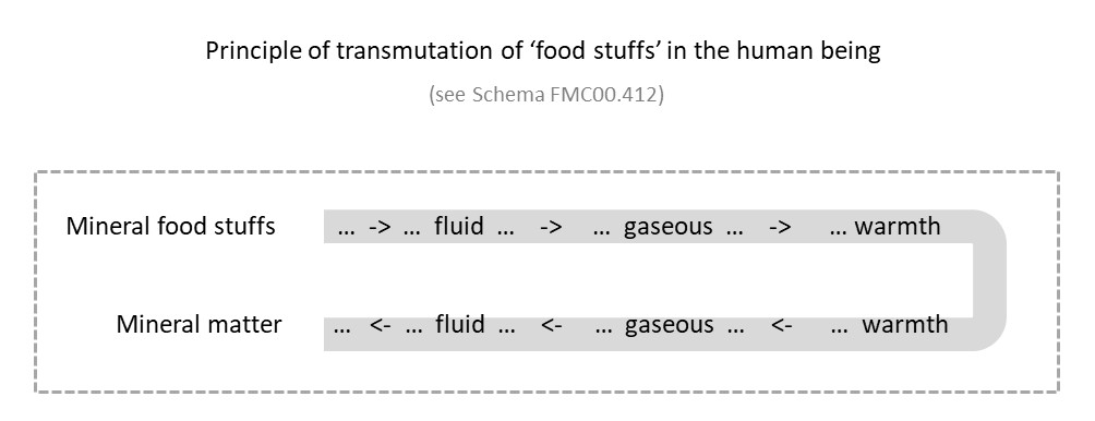 FMC00.412A shows the principle of transmutation of 'food stuffs' in the human being: Man takes in physical food and liquids, and these are broken down in the human organism and distributed in fine form (substance/force) throughout the body - see Schema FMC00.513A and Schema FMC00.513