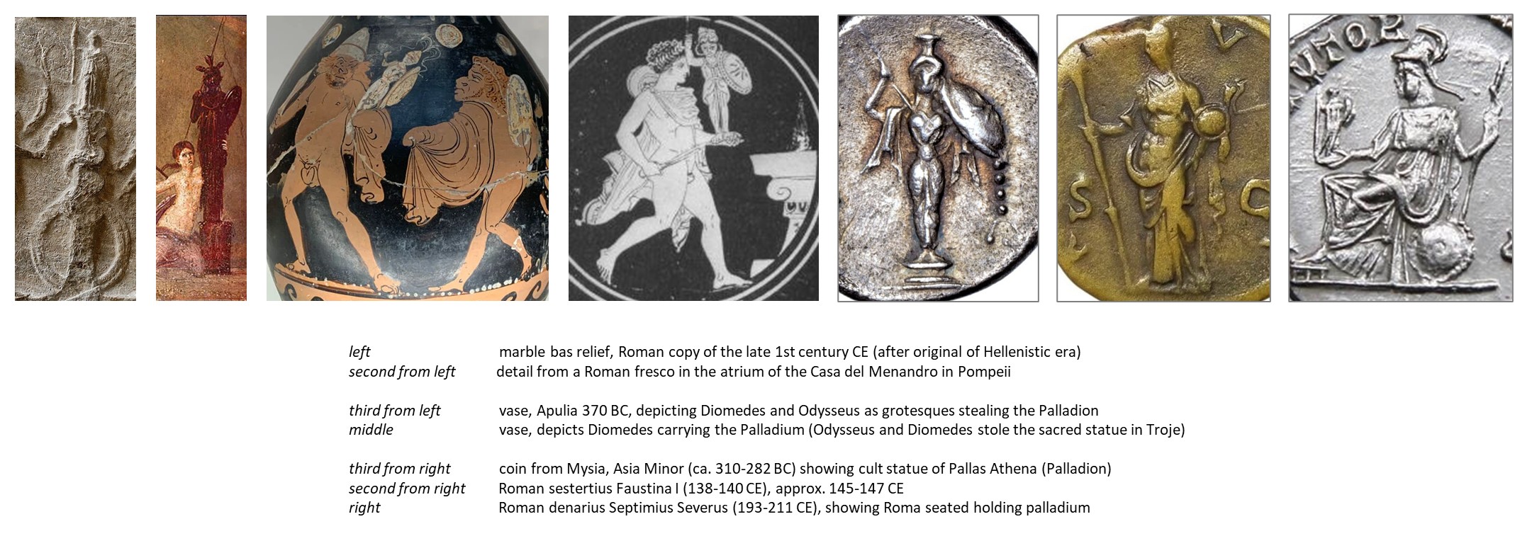 FMC00.684 shows various ancient illustrations of the ancient Greek deity Pallas Athena, and (middle) 'possibly' the Palladium (in Latin) or Palladion (in Greek), a.o. on vases and coins. Note the remarkable consistency over the centuries from the 4th century BC to 2nd century CE.
