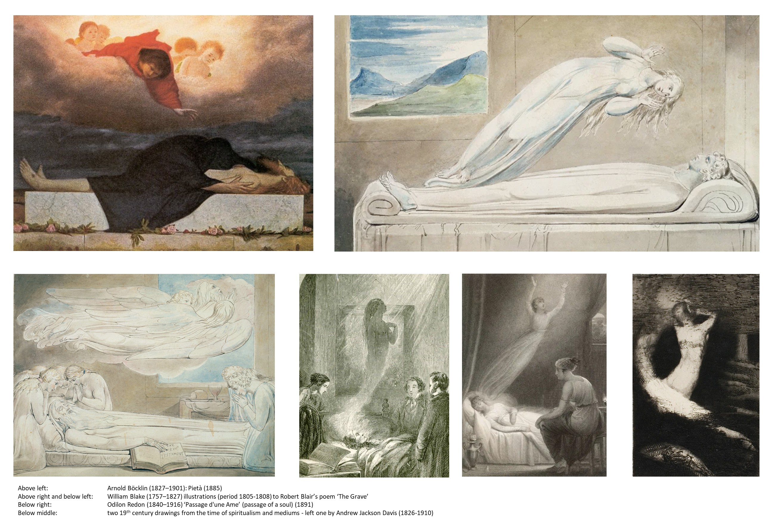 FMC00.687 shows a selection of artwork by a.o. Arnold Böcklin, William Blake and Odilon Redon depicting Man's physical body, soul and angel in context of the soul leaving the body at the moment of death of the physical body, or during out of body experiences (OBE) such as e.g. during near death experiences (NDE).